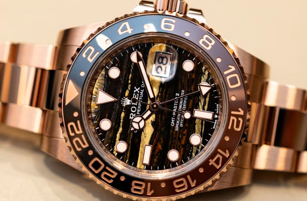 From a process perspective, Rolex notes that the entire dial plate is not solid ceramic. Rather, the dial is a disc of ceramic affixed to a brass base plate, no doubt to help with ceramic’s more brittle properties. This process is just like how stone dials are produced, taking a thin slice of the material and putting it on top of a base layer. And that, my friends, is a perfect segue into the other best clone Rolex watches I was able to see — the Everose GMT-Master II with tiger iron dial.